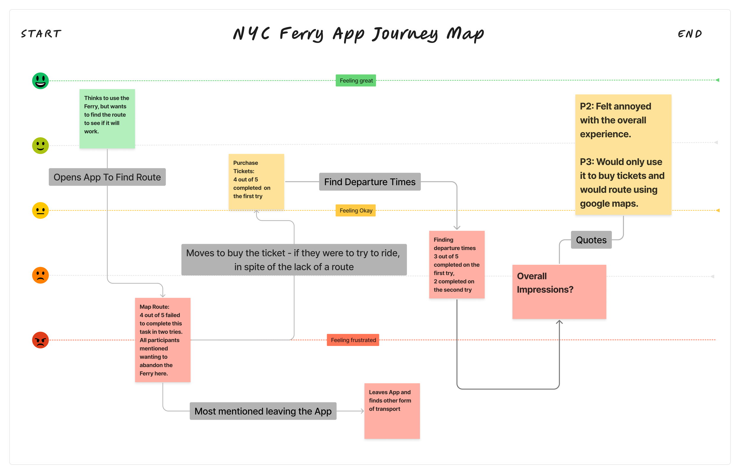 Regardless of the sampling method, I do feel this initial study shows new users and non-frequent riders seem to really struggle to understand the app and how to get the information they are looking for within the system. My suspicion is that this would have an impact on how easily the ferry is able to attract new riders.