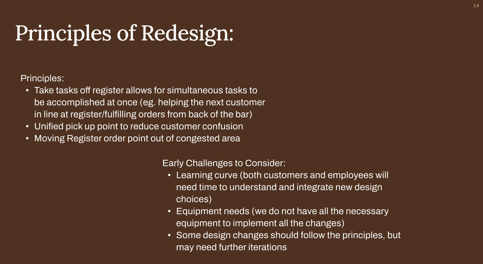 All of the design choices were made in collaboration with the baristas, back-of-house, the pastry chef, and bar manager, utilizing the research as guiding principles for what should change. These insights and recommendations were then presented to the owner. The shop is now in the process of integrating changes.